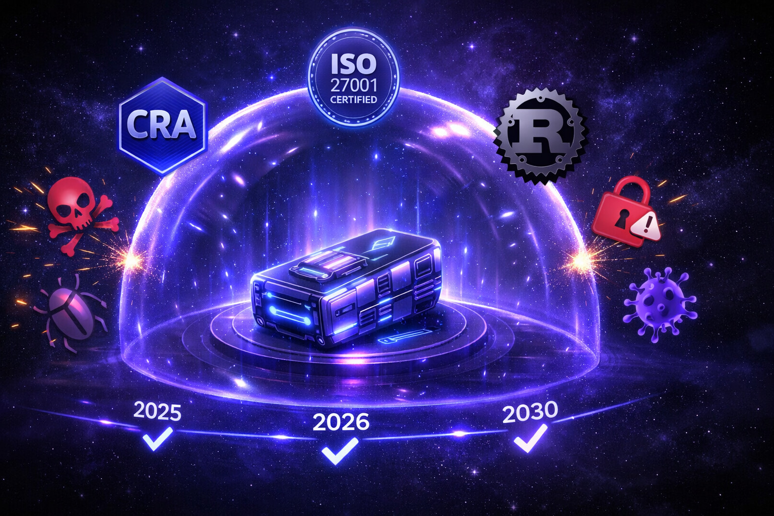 The regulatory landscape is changing fast. The European Cyber Resilience Act (CRA) is becoming mandatory. Oktima makes compliance simple — built on Rust for inherent security, developed under ISO 27001 certification, with Secure Boot and encryption built-in. Your products are ready for tomorrow's requirements today.