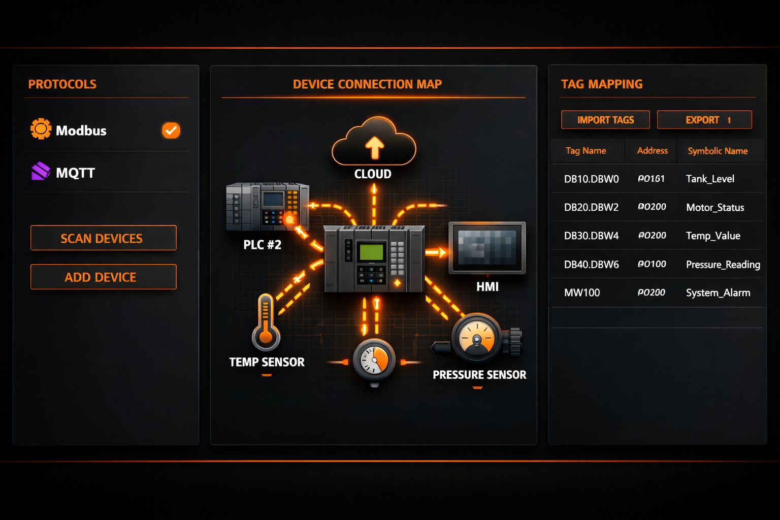Connect to PLCs, sensors, and cloud platforms with ease. Map tags to symbolic names through a clean, intuitive interface.