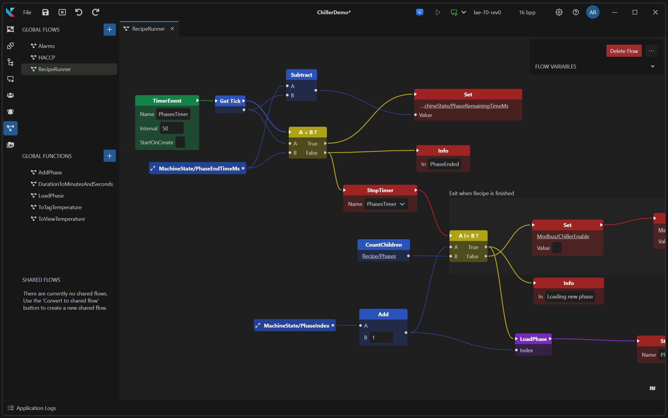 Build application logic by connecting visual blocks — no code required. Powerful enough for complex control systems, accessible to non-programmers.